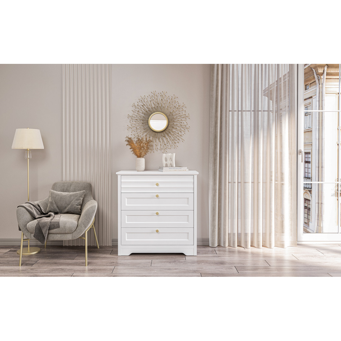Денвер – это новая коллекция корпусной мебели для спальни, гостиной и столовой. Прямые строгие линии в сочетании с легкой горизонтальной волной на фасадах придают мебели элегантный и уверенный вид. Белый матовый цвет мебели, любимый многими за универсальность, можно сочетать с любым оттенком стен и пола. Округлые металлические золотые ручки разбавляют строгий и лаконичный вид фасадов и добавляют интерьеру утонченности.