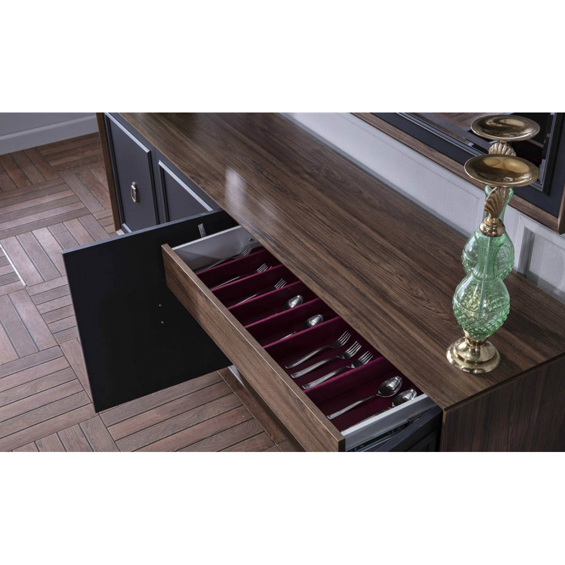 Функциональность буфета была увеличена за счет применения сетки столовых приборов. Благодаря телескопической направляющей, расположенной во внутреннем ящике для столовых приборов, ящик можно полностью открыть, и таким образом можно удобно пользоваться.