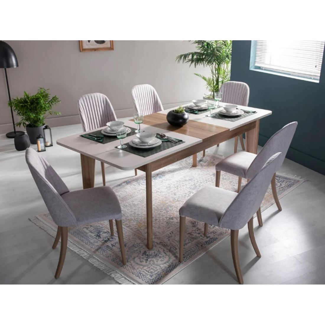 Функциональный раскладной стол Mavenna от Bellona. Дополнительная вставка и ножки цвета орех. Подойдет для гостиной и кухни. Стол имеет размер 204х90х77 в разложенном виде, что позволит разместить за ним от 6 до 8 человек.