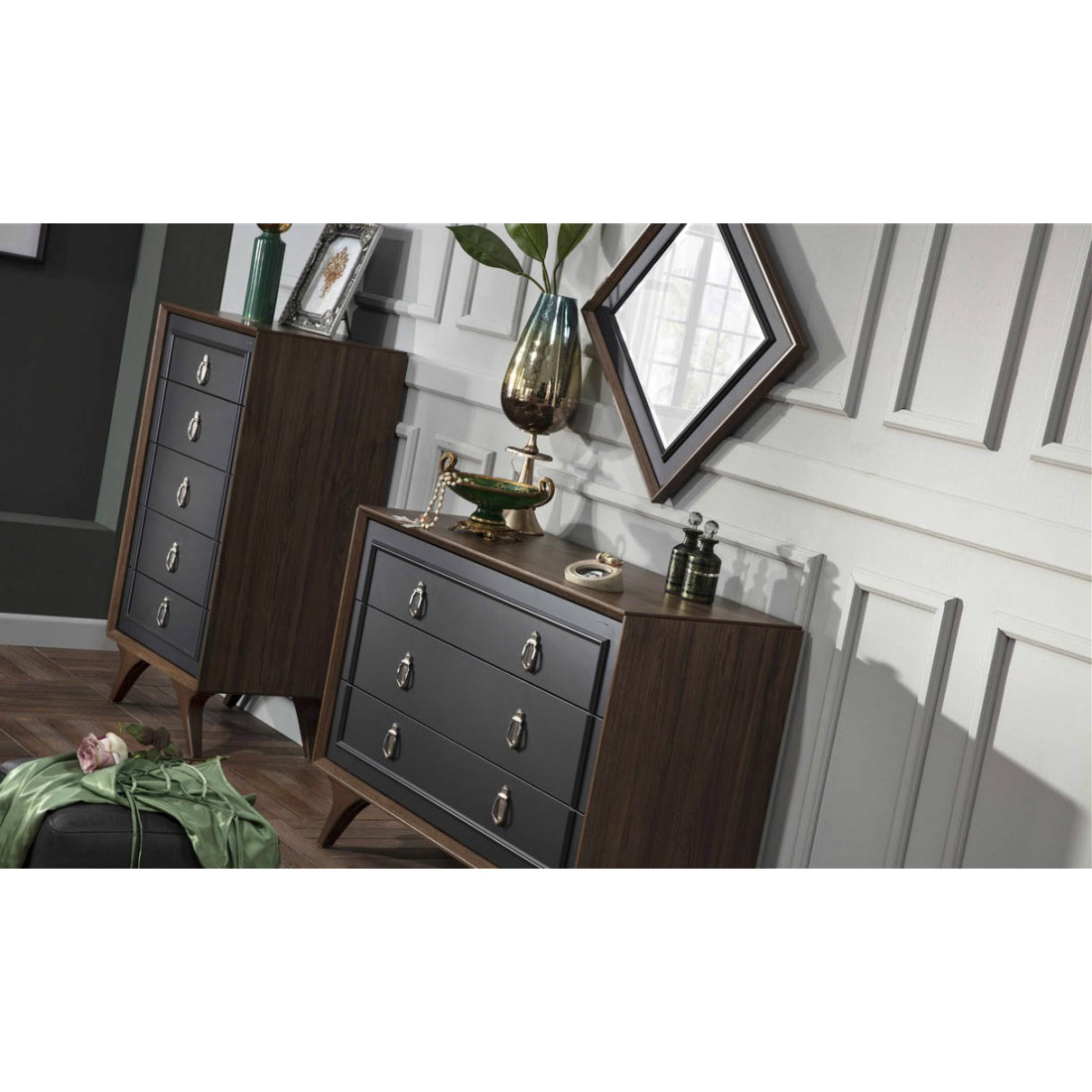 Узкий бельевой комод ALEG-28 серии Алегро от Беллона высотой 1172мм с пятью вместительными ящиками дополнит интерьер даже самой малогабаритной спальни и никогда не останется незамеченным: сочетание темной столешницы и фасадов с декоративными вставкамики.Комод можно купить отдельно, но эффектней в составе общей композиции.